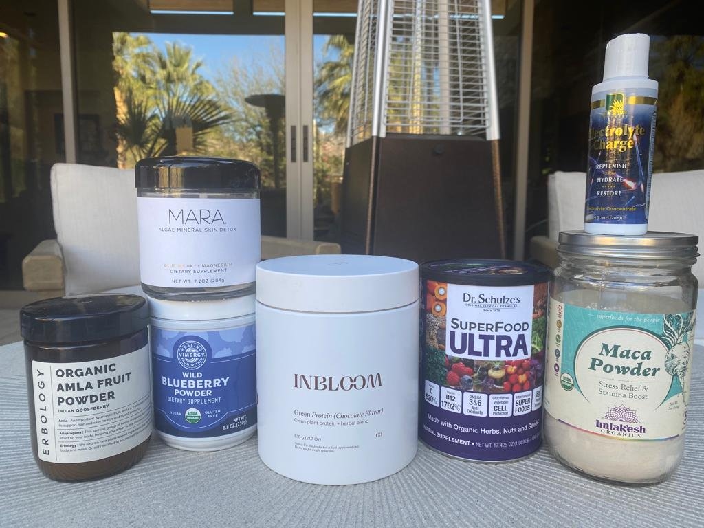 Finally, I add a scoop of different powders: maca powder, wild blueberry powder, organic Amla fruit powder (for skin, hair) , "Inbloom" green protein powder and the SuperFood ultra blend from Dr. Schulze's.