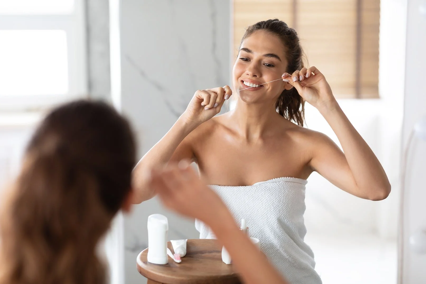 I also pay particular attention to my tongue. Our tongues can harbor a lot of oral bacteria, which can lead to bad breath and contribute to dental plaque buildup. I use a copper tongue scraper from Living Libations morning and night to get the gunk out. And of course, flossing is a must in my routine. I floss every night after brushing to remove food particles and plaque that brushing alone might miss.